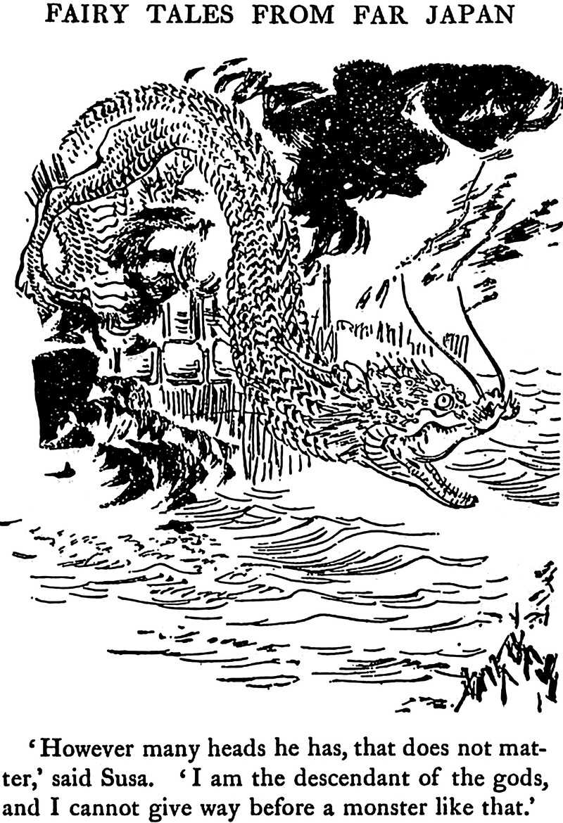 However many heads he has doesn't matter, for "I am the descendant of the gods, and I cannot give way before a monster like that." From Fairy Tales from Far Japan translated by Susan Ballard, 1908.