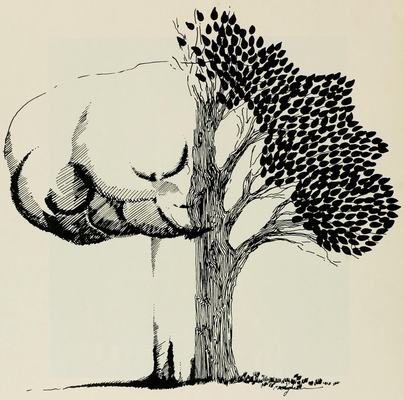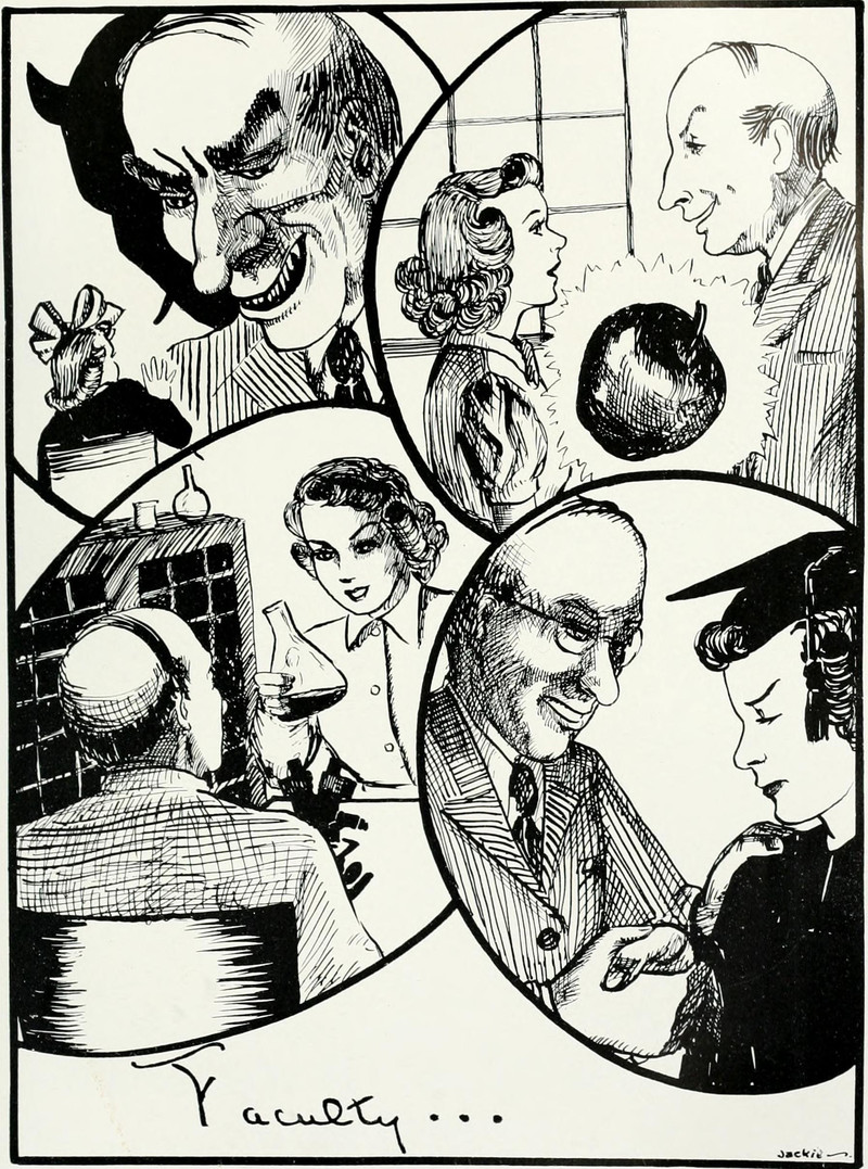 The faculty as demonic entities: a shadow with devil horns, an offering of a forbidden apple to an innocent Eve, a presumably poisonous beaker, and a final handshake as if she's sold her soul for a degree. From American University's 1940 yearbook.