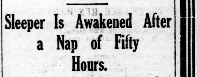 "Sleeper is awakened after a nap of fifty hours."  From the Duluth Herald, 1911.