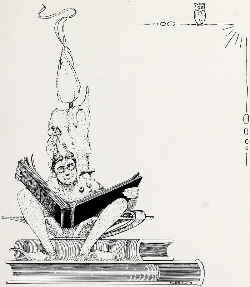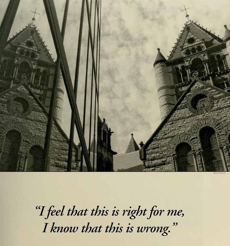The world beyond the looking glass: "I feel that this is right for me; I know that this is wrong." From Boston College's 1998 yearbook, indexed as being published in 1913 over at Archive.org, thus proving that the book bends time.
