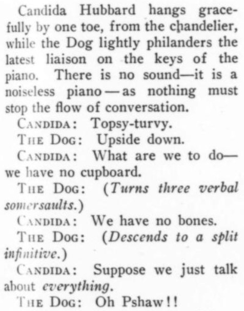 ***[from a spoof horoscope]A slight shimmying motion of Venus and Mercury has the effect of doubling Barnum's law of one sucker per minute.***the Drivoli Theatre***a woman at odds with the Sphinx-riddle of education***At first we thought that the title ["Millions"] referred to the number of times the author was going to say the same obvious thing.***Mr. Hooker...confuses rhyming long words ending in "-ation" and names of cities ending in "-tucket" with uplift in lyric writing. [Benchley]***[Bonus: A film-review column reminded me that when Felix the Cat is startled or perplexed, his tail turns into a question mark.]Notes on some of the attachments:1. As you will gather, these slightly bizarre "Intimate Glimpses" cartoons are a series (we had one earlier, labeled by me simply as "what is going on here?" or the like).2. As you will probably also gather, the "Hubbard" bits are from a piece retelling the Old Mother H. tale à la various playwrights.3. The bonus Pep-O-Mint ad is actually not from Life 1922, but from Cosmopolitan 1920, but I decided to pair it up with its cousin.