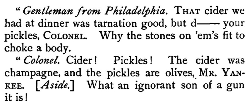Gentleman from Philadelphia: That cider we had at dinner was tarnation good, but d— your pickles, Colonel. Why the stones on 'em's fit to choke a body.