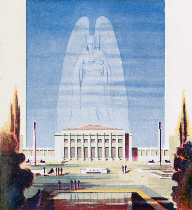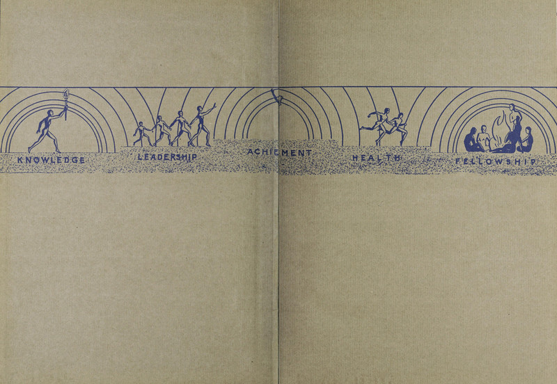 The seam cuts down to the central figure into just a head and one arm in rainbow. As for that word "achiment," this predates V-E Day by a dozen years. The endpapers to Park College's 1932 yearbook.