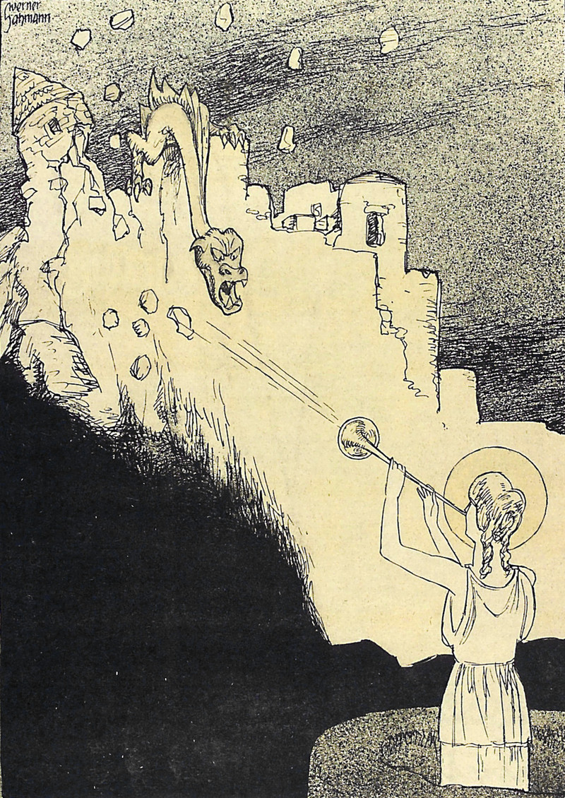 "Love and Death," with Death having collapsed and blind Love stepping forward. From Fliegende Blätter, 1925.
