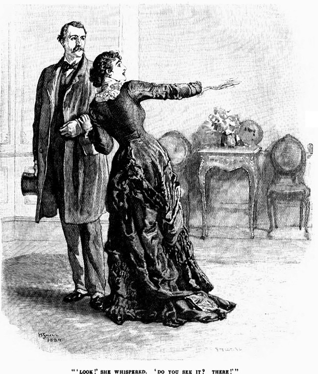 An illustration from an 1897 issue of The Strand magazine. The caption reads: "The reflections were now frightfully distorted."