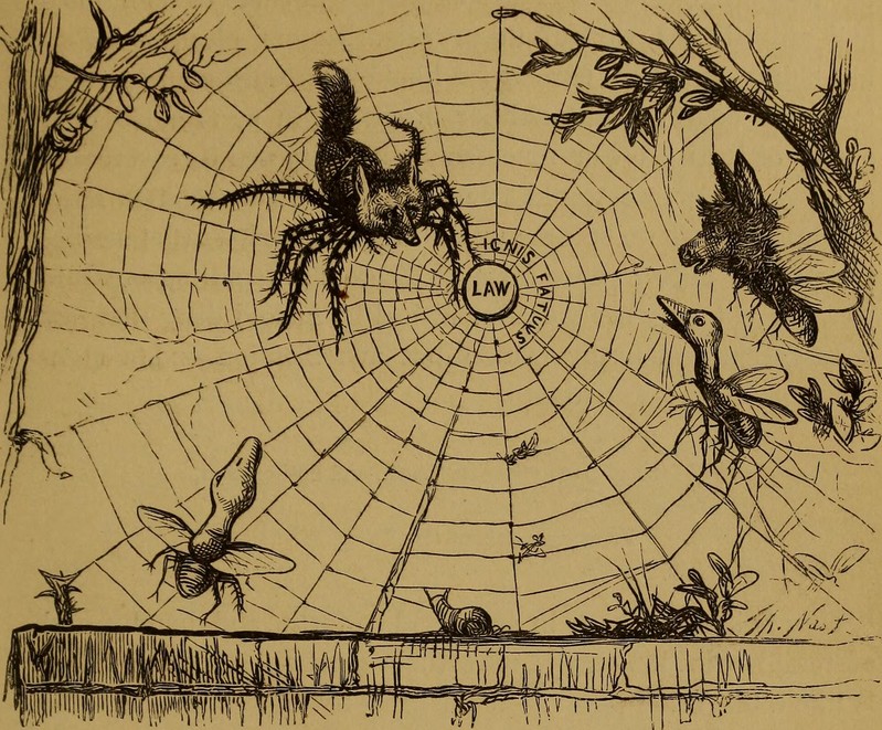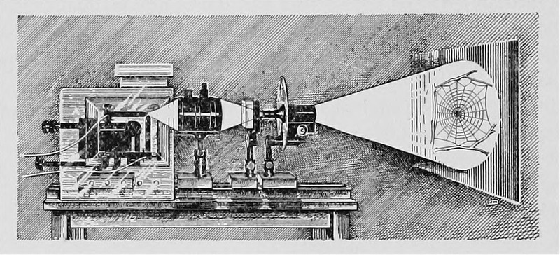 Here's a precursor to the art installation by Stefan Sagmeister in which a viewer’s movement can disrupt a projected spider web ( video here). From The Microscope by Simon Henry Gage, 1917.
