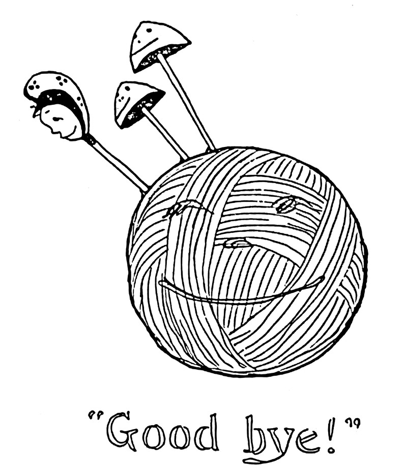 #vintage illustration #anthropomorphism #faces in things #the end #yarn ball #knitting needles