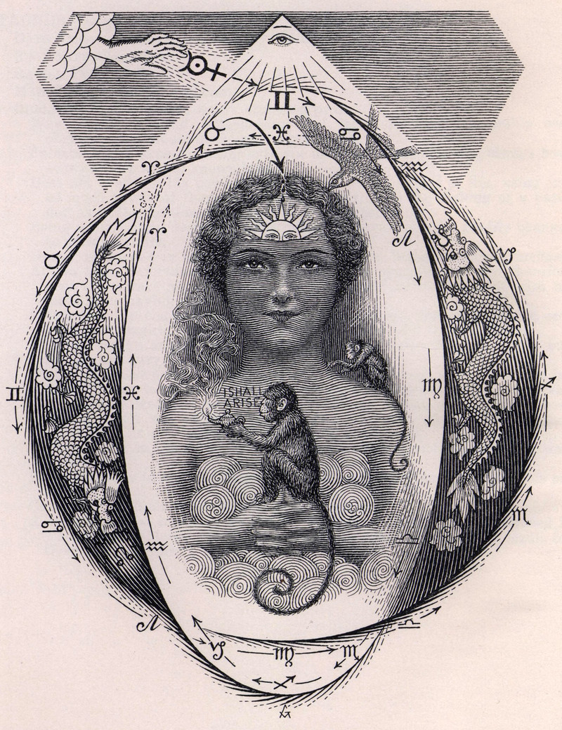 "This talisman, which means 'the keeper, the holder,' is believed to protect man from the machinations of the evil spirits and to enable those who hang it up in their houses, or who wear it as an amulet, to resist the temptations to sin prompted by these demons. The form of this talisman is circular. In the centre is a smaller inner circle; in a second, larger circle is traced a star, and along the inner side of this circle and in the eight intersectional compartments formed by the corners of the star are inscribed the names of hostile spirits. Outside the circles are seen a male and a female, the arms of the one figure tied with chains to the feet of the other." From Buddhism in Tibet by Emil Schlagintweit, 1863. See Strange Talismans for Strange Times.