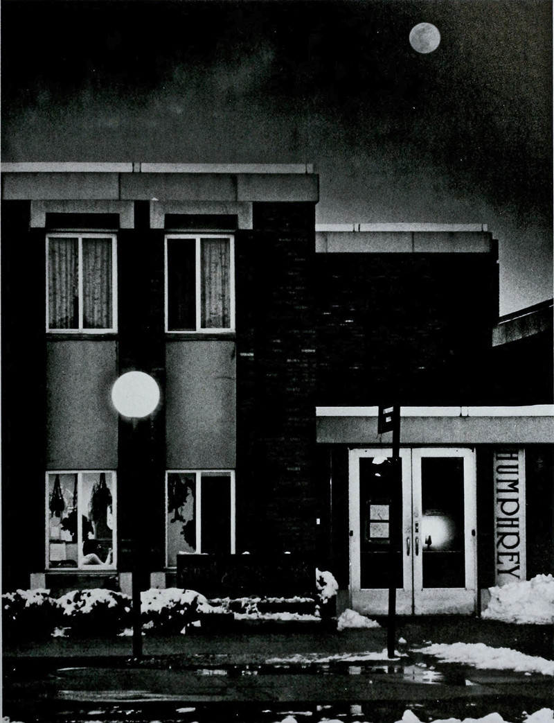 A full moon above, in front of, and inside of the building.  From Kent State's 1983 yearbook.