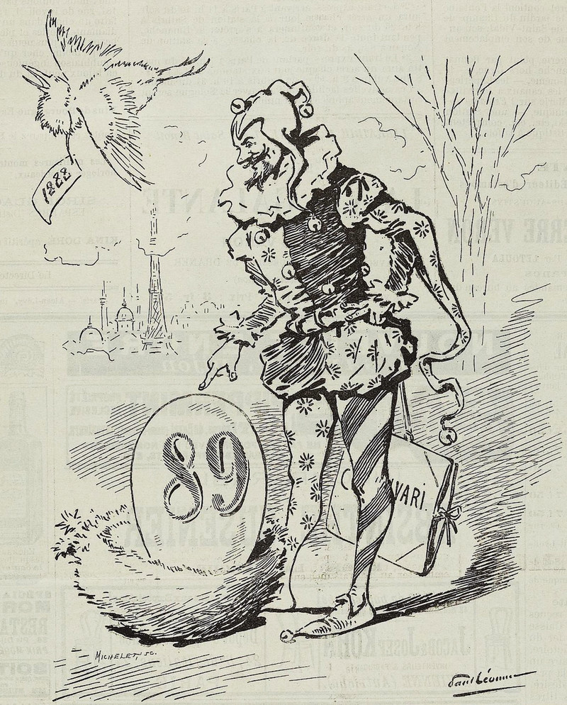 Every new year is a victim of "abandoned nest syndrome" and is left in the care of one clown or another.  From Le Charivari, 1889.