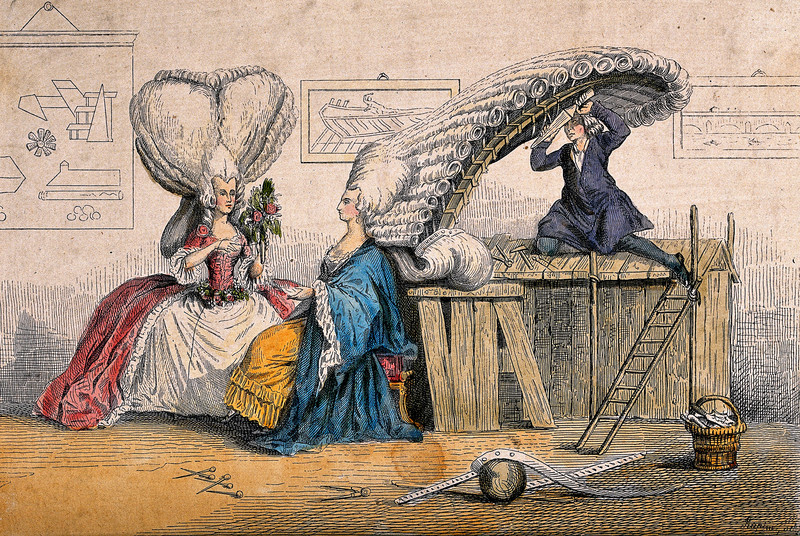 "A man building a wig on to the head of a woman on a kind of scaffolding while another woman wearing a tall wig looks on." Coloured etching by Maximilien Rapine, 18th century.