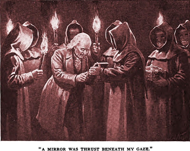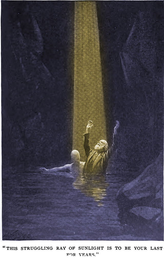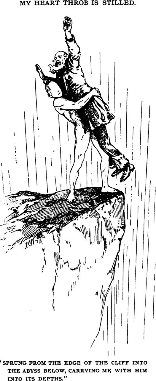 Etidorhpa, or The Strange History of a Mysterious Being and the Account of the Initiate's Remarkable Journey by John Uri Lloyd (1895). The caption reads: "My heart throb is stilled. Sprung from the edge of the cliff into the abyss below, carrying me with him into its depths."