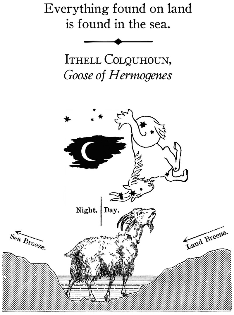 The text reads, "Everything found on land is found in the sea." —Ithell Colquhoun, Goose of Hermogenes
