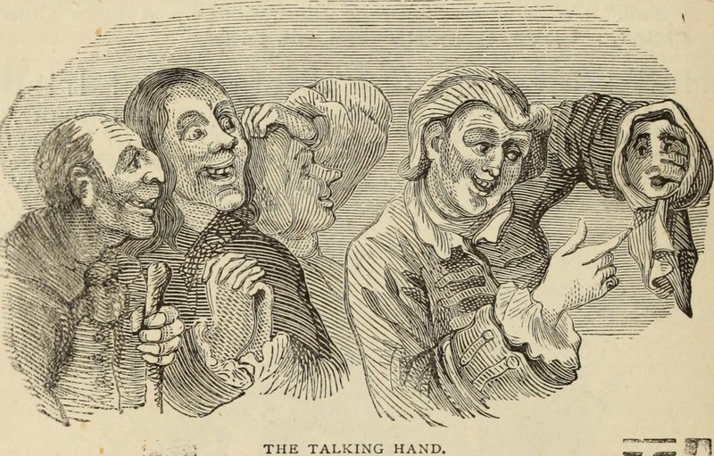 Here's a precursor to Wenceslao Moreno's "Señor Wences" act, from A History of Advertising from the Earliest Times by Henry Sampson, 1874.