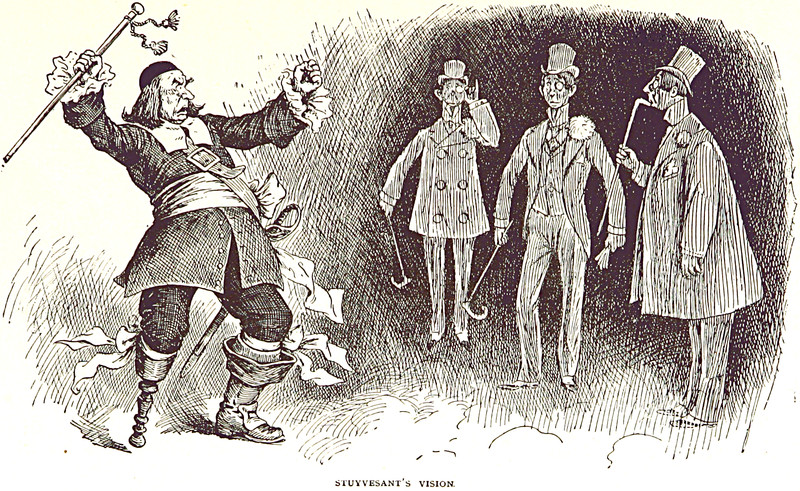 "Stuyvesant's vision," from Bill Nye's History of the United States, illustrated by F. Opper, 1894.  Note that Stuyvesant is missing the wrong leg here.