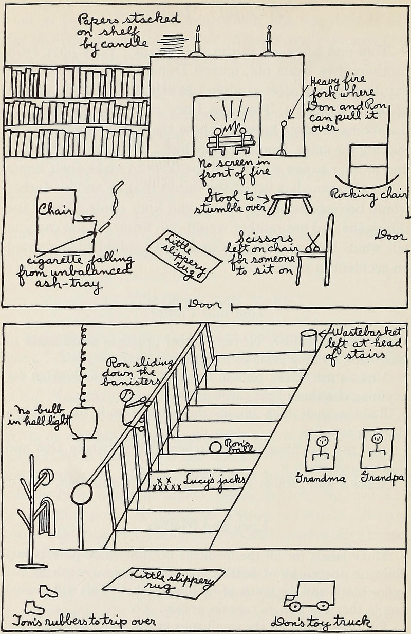 "Scissors left on chair for someone to sit on."  From Building Good Health by Andress, Goldberger & Hallock, 1939.