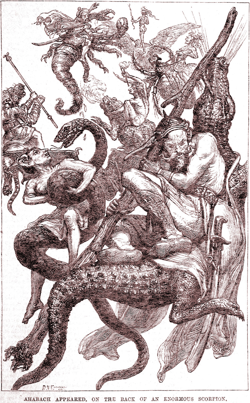 "Ahabach appeared, on the back of an enormous scorpion," from Dicks' English Library of Standard Works, 1884.