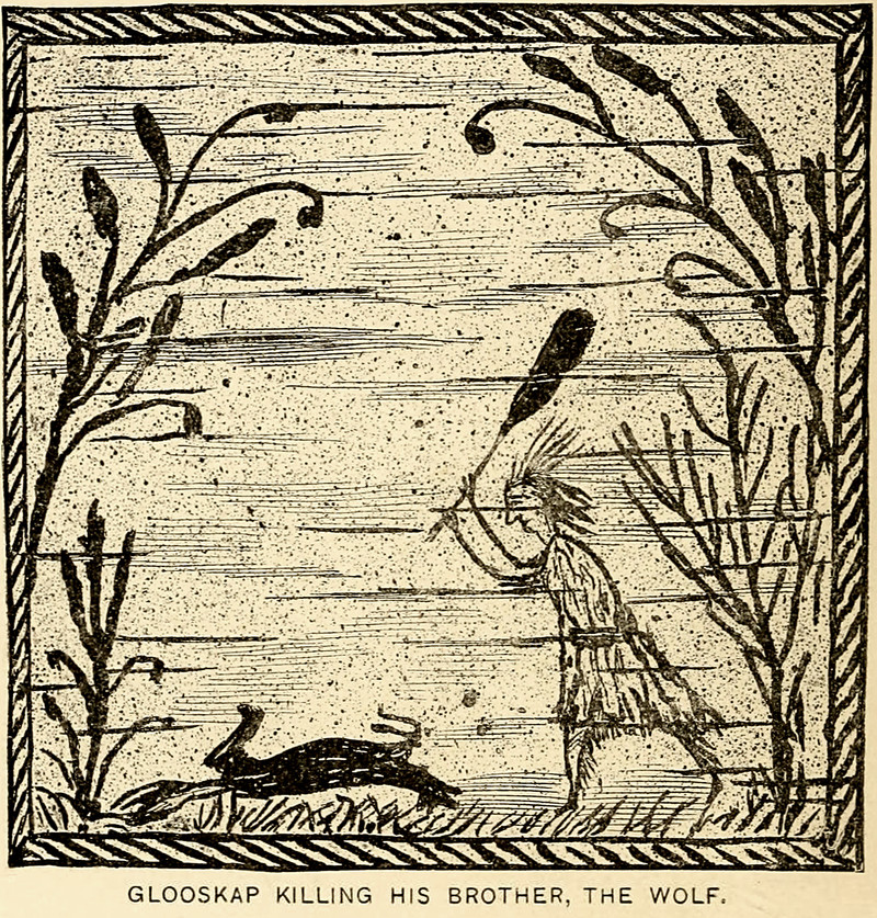 "Glooskap killing his brother, the wolf."  From The Algonquin Legends of New England by Charles Godfrey Leland, 1884.