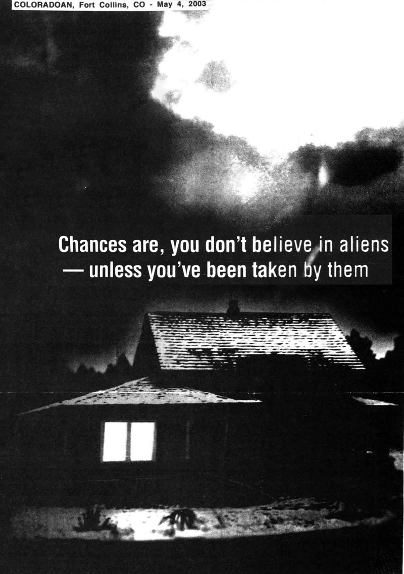"Chances are, you don't believe in aliens -- unless you've been taken by them." Via UFO Newsclipping Service, 2003.