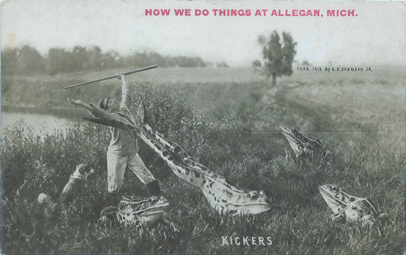 #frog #vintage postcard #michigan #giant frog #allegan #postcard