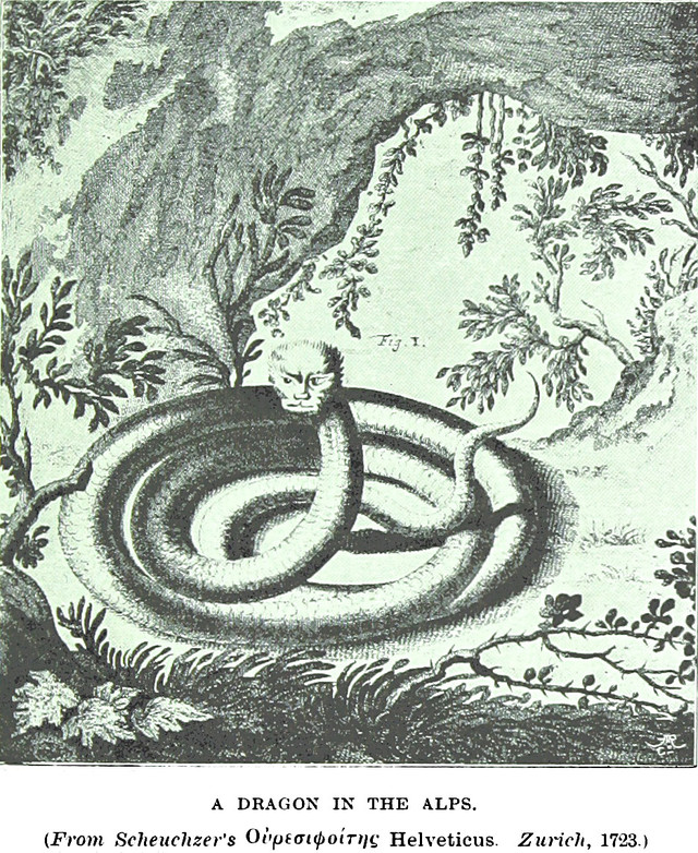 An illustration from Alpine Memories by Emile Javelle (1899).  The caption reads: "A Dragon in the Alps.  (From Scheuchzer's Ouresiphoites Helveticus, Zurich, 1723.)"