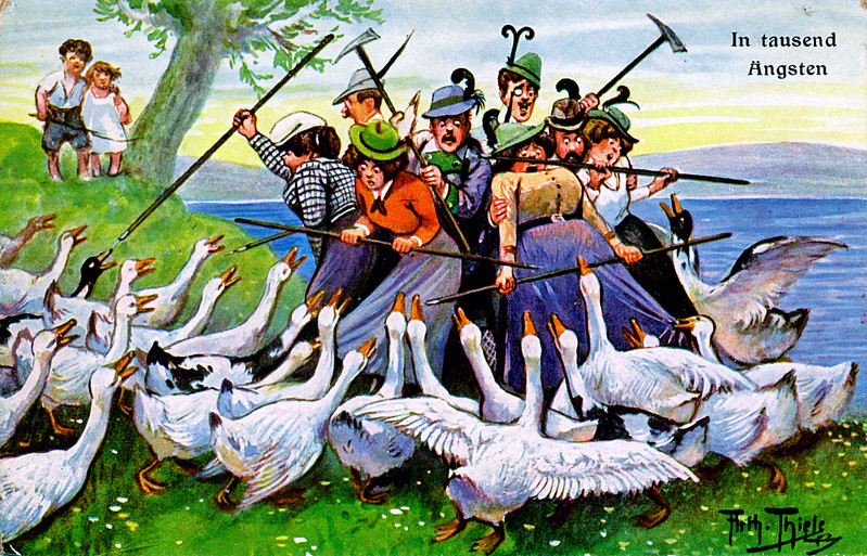 Anatidaephobia, the fear of geese.  A World War I-ear postcard by Arthur Thiele.