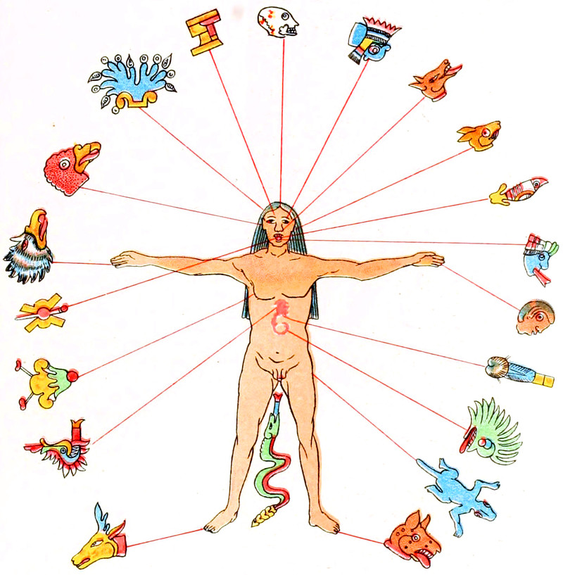 The Codex Vaticanus explains that these ancient Mexican symbols are the twenty figures that rule over men [deer or stag, wind, rose, earthquake, eagle, vulture, water, house, skull or death, rain, dog, rabbit, flint, air, monkey, cane, grass or herb, lizard, tiger, and serpent] and that cure in a corresponding manner those who become ill or suffer pains in any part of the body.  "The sign of the wind is assigned to the liver; the rose to the breast; the earthquake to the tongue; the eagle to the right arm; the vulture to the right ear; the rabbit to the left ear; the flint to the teeth; the air to the breath; the monkey to the left arm; the cane to the heart; the herb to the bowels; the lizard to the womb of women; the tiger to the left foot; the serpent to the male organ of generation, as that from which their diseases proceed in their commencement; for in this manner they consider the serpent, wherever it occurs, as the most ominous of all their signs."  From the Annual Report of the Bureau of Ethnology, 1889.