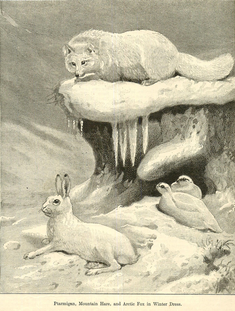 "Ptarmigan, mountain hare, and arctic fox in winter dress."  From Chatterbox, 1907.