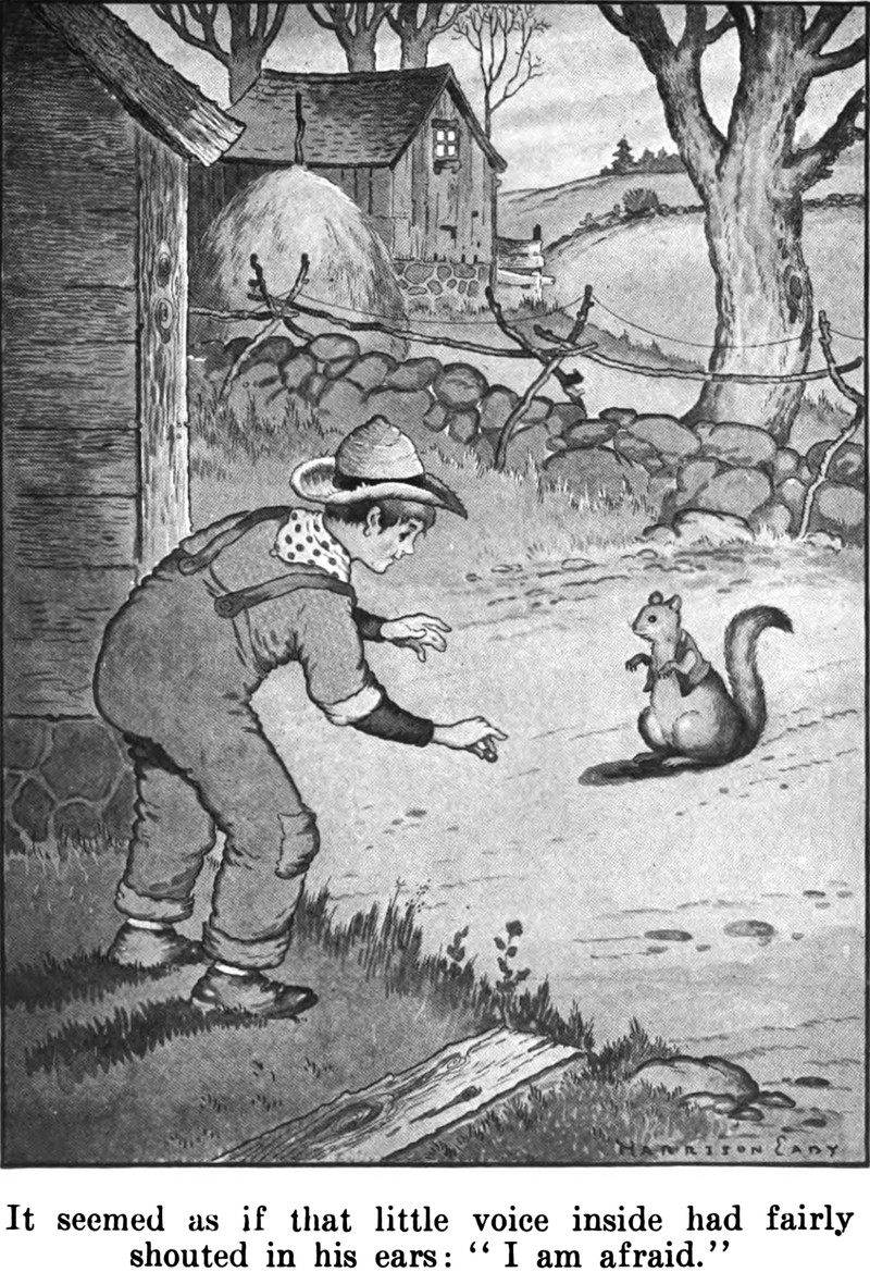 "It seemed as if that little voice inside had fairly shouted in his ears: 'I am afraid.'" From The Adventures of Chatterer the Red Squirrel by Thorton W. Burgess and illustrated by Harrison Cady, 1919.