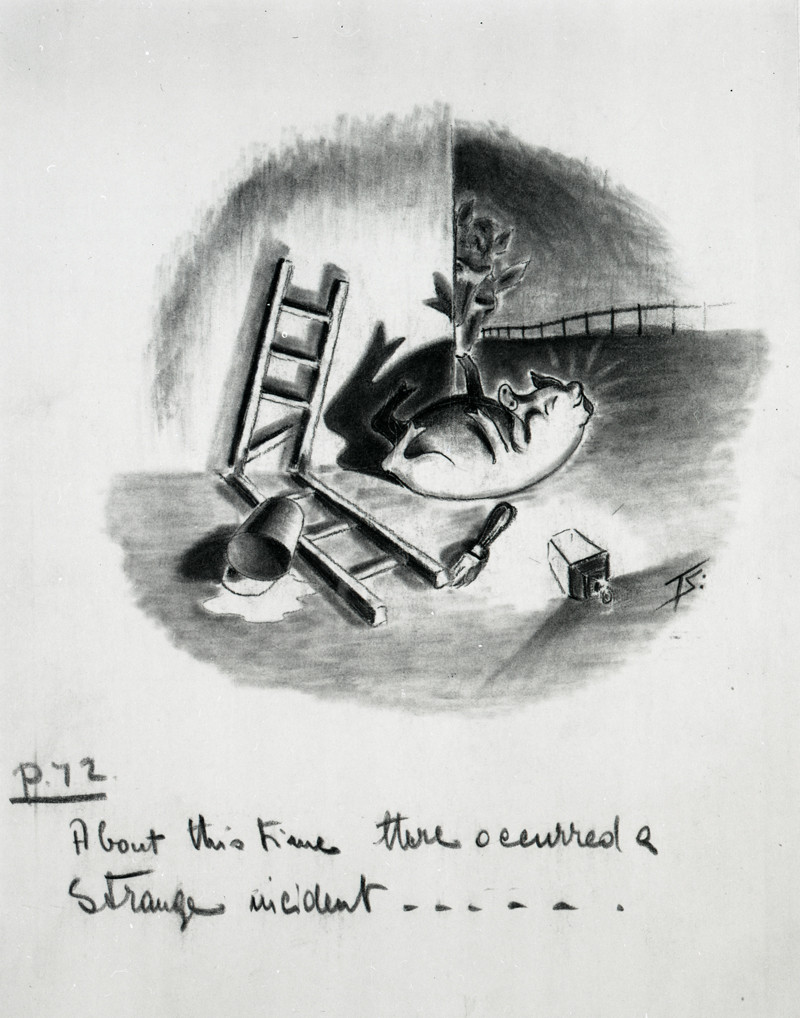 "About this time there occurred a strange incident."  A preliminary drawing for a 1950 strip cartoon version of Animal Farm from the cartoonist Norman Pett and his writing partner Donald Freeman.