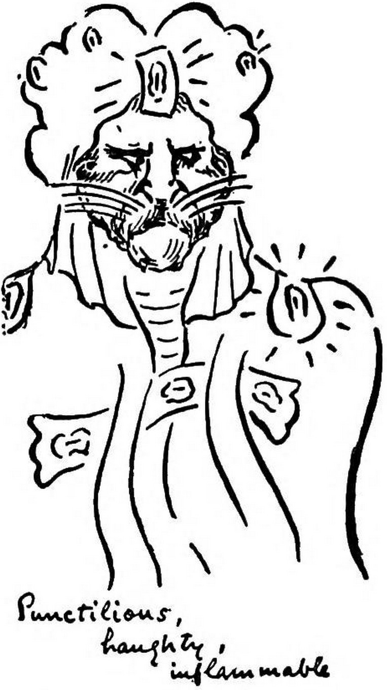 "Punctilious, haughty, inflammable."  From This Simian World by Clarence Day, 1920.