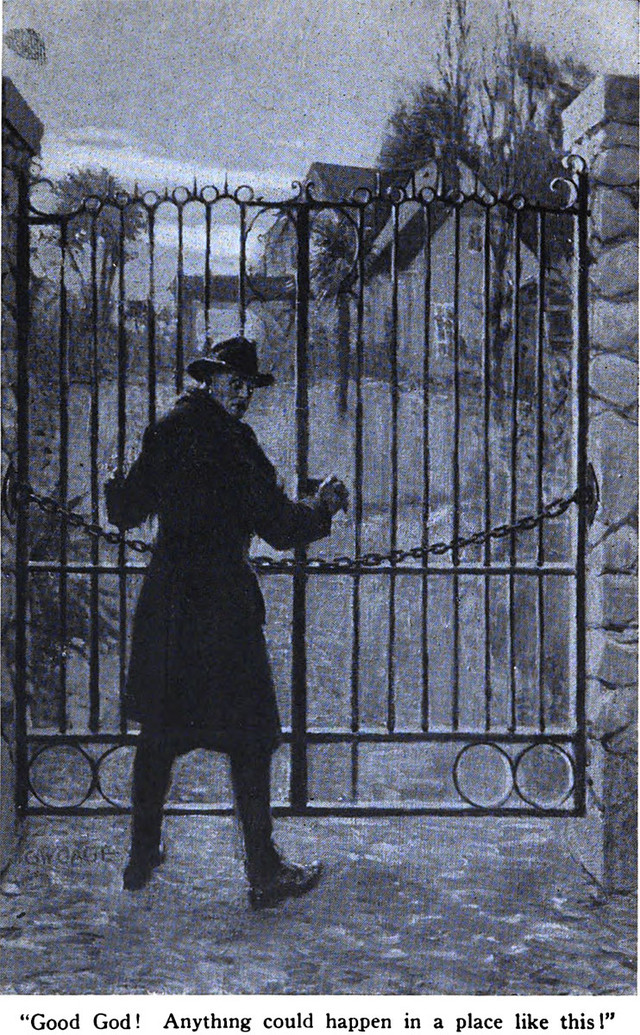 An illustration from The Rest Hollow Mystery by Rebecca Newman Porter (1922).  The caption reads: "Good God! Anything could happen in a place like this!"