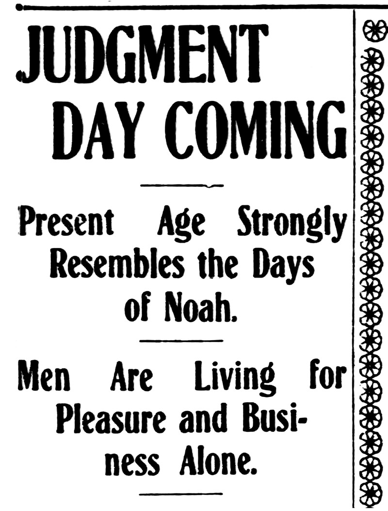 "Judgment day coming. Present age strongly resembles the days of Noah. Men are living for pleasure and business alone." From the Duluth Evening Herald, 1908.