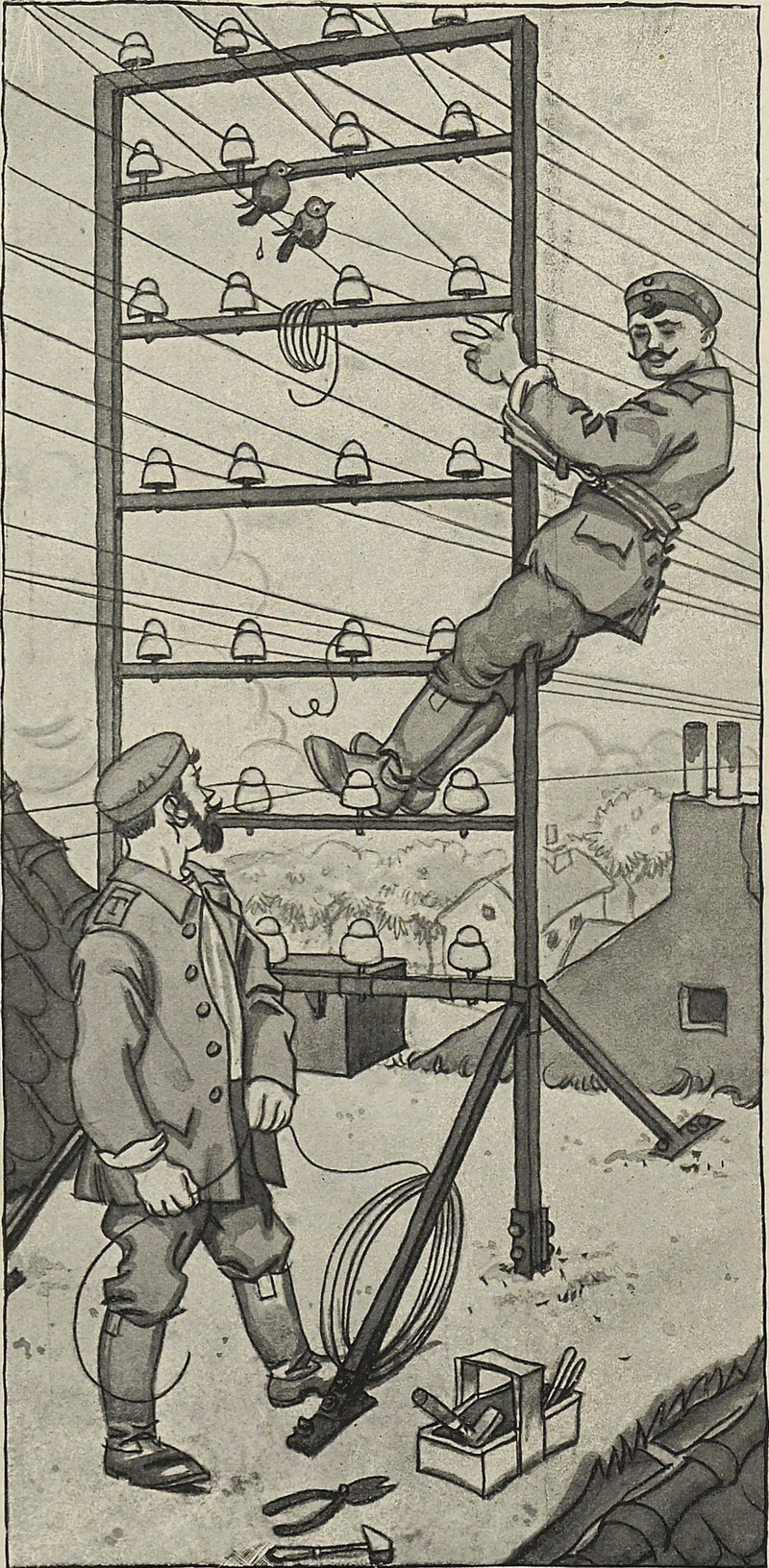 #vintage illustration #rooftop #electricity #are friends electric #power lines