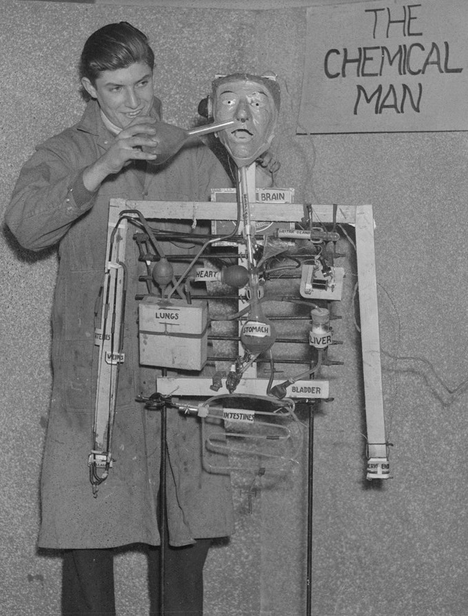 "Hyman Gordon, 15, Boston, Mass., demonstrates his 'chemical man' he built out of bits of rubber, glass, cigar boxes and other odds and ends. When the figure is stuck with a pin he reacts after the manner of a mortal. He eats and digests food. The tubes here indicate the lungs, heart, bladder, intestines, etc." (Milwaukee Sentinal, Jan, 11, 1936). Photo by Leslie Jones.