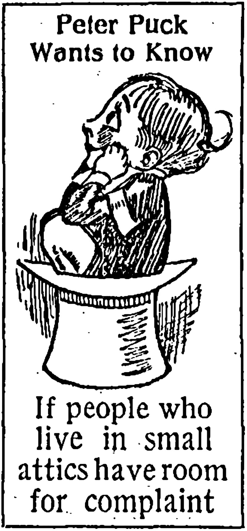 "Peter Puck wants to know if people who live in small attics have room for complaint."  From The Children's Newspaper, 1933.