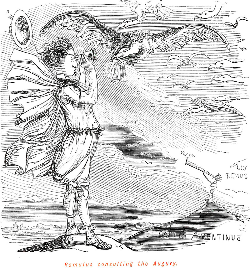 An illustration from The Comic History of Rome by Gilbert Abbott a'Beckett, illustrated by John Leech (1897). The caption reads: "Romulus consulting the Augury."