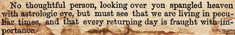 "No thoughtful person, looking over yon spangled heaven with astrologic eye, but must see that we are living in peculiar times, and that every returning day is fraught with importance." From The Royal Kalendar by Francis Moore, 1853.