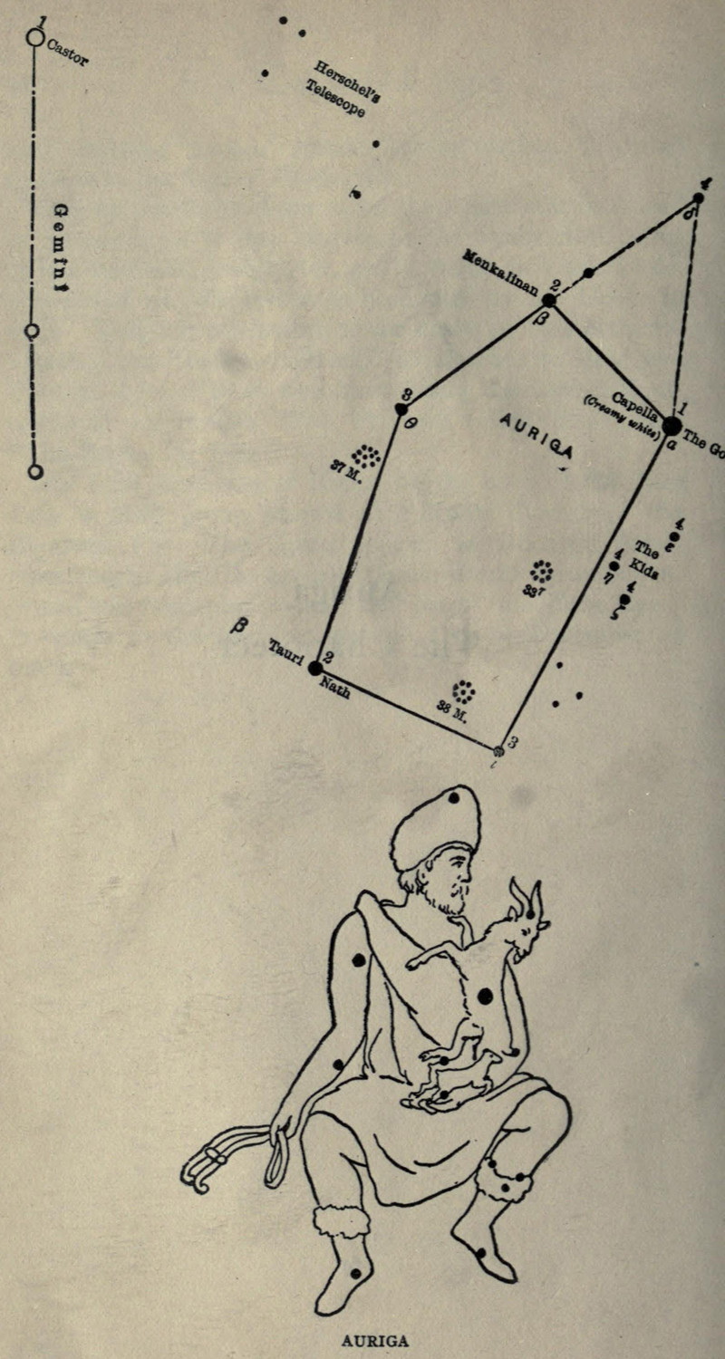 Two ways to find a cosmic charioteer holding a goat. From Star Lore of All Ages by William Tyler Olcott, 1911.