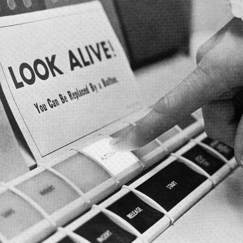 "Look alive!  You can be replaced by a button."  From North Texas State University's 1968 yearbook.