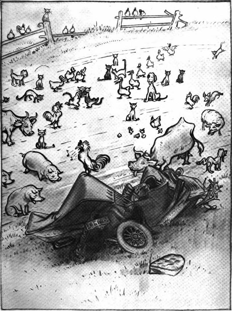 Animals rejoice over a car accident.  From The Judge, 1916.