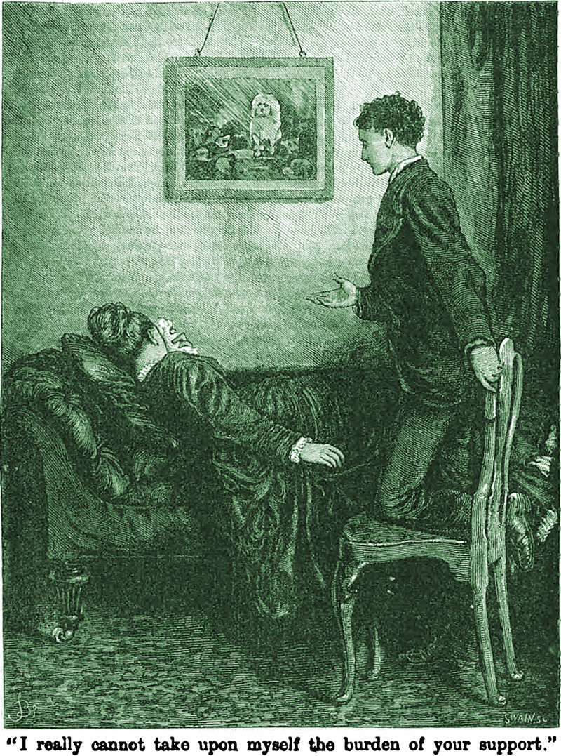 Here's a precursor to Ayn Rand, from The Quiver, 1875.  The caption reads, "I really cannot take upon myself the burden of your support."