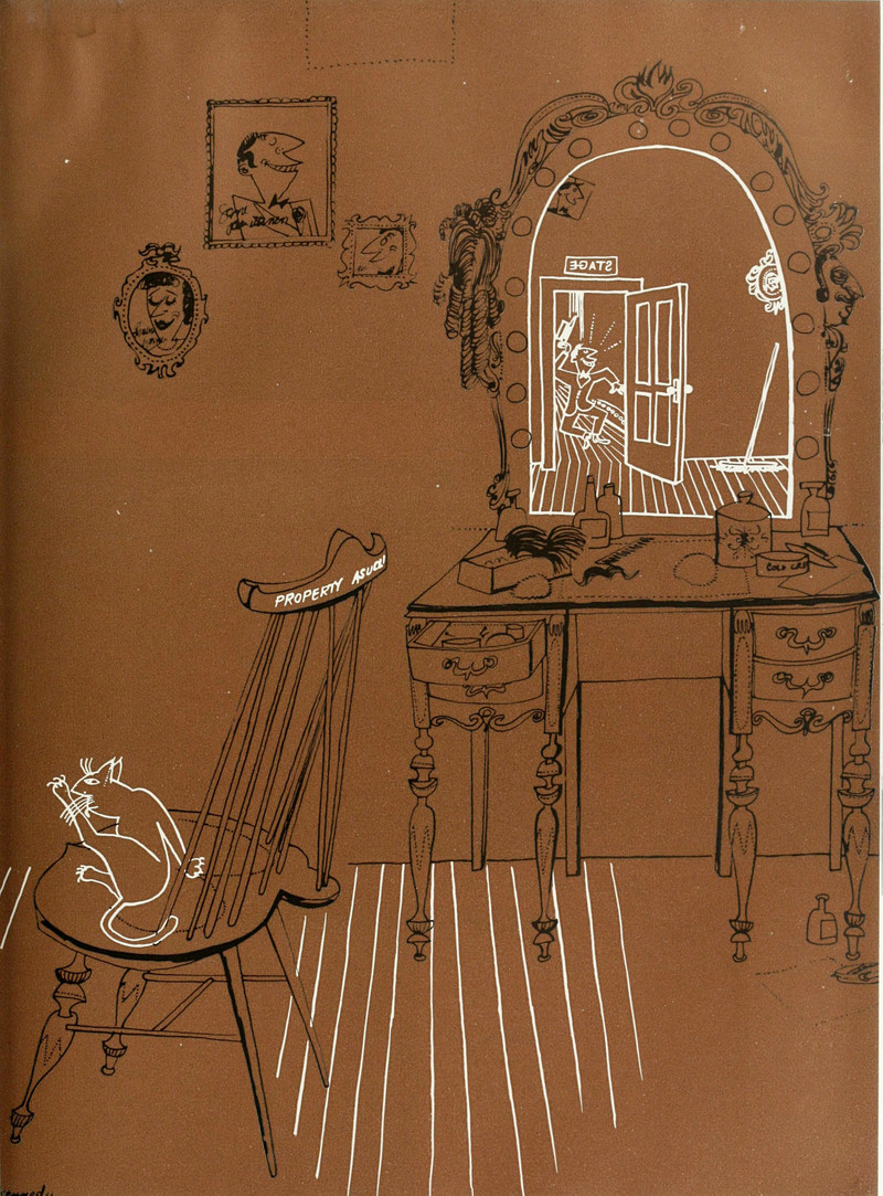 #vintage illustration #cat #vintage yearbook #yearbook #illustration #1950s #backstage #dressing room