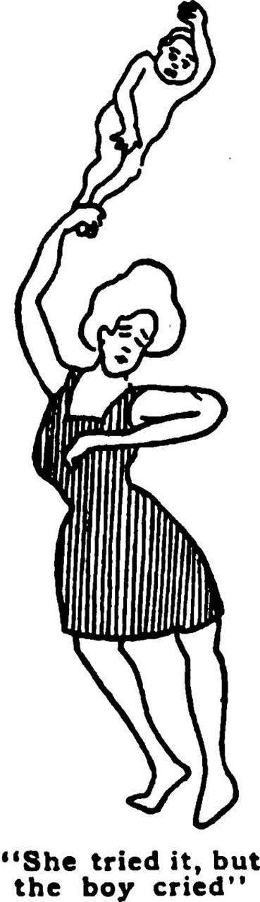 An illustration from a 1906 issue of Good Housekeeping magazine.  The caption reads: "She tried it, but the boy cried."