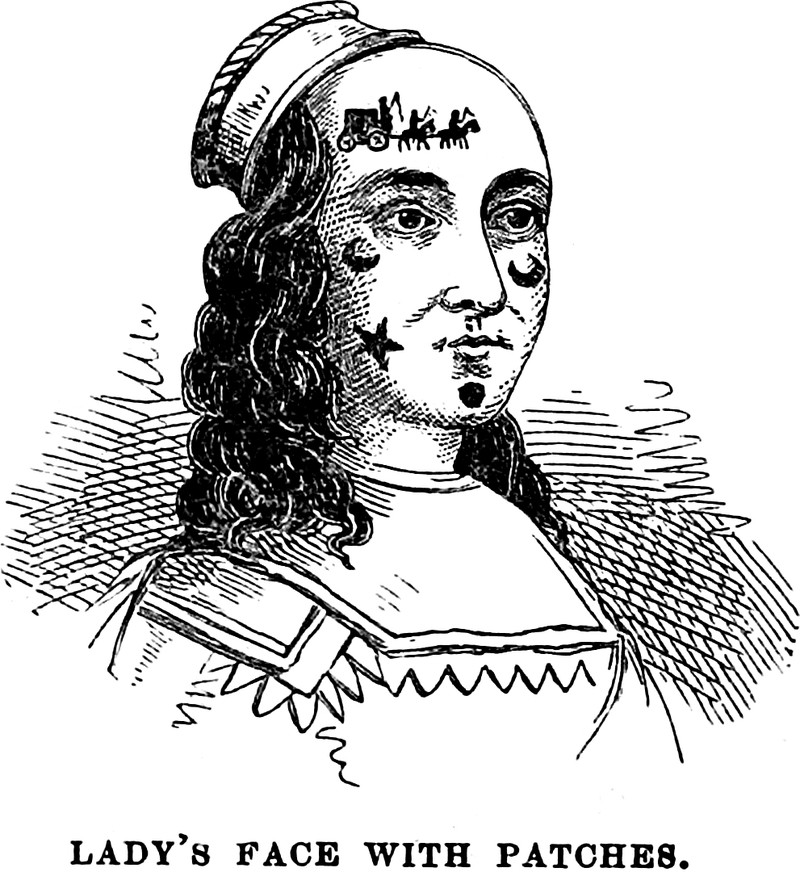 Here's precursor to decorative adhesive strips, from The National and Domestic History of England by William Hickman Smith Aubrey, 1878.  The caption reads, "Lady's face with patches."