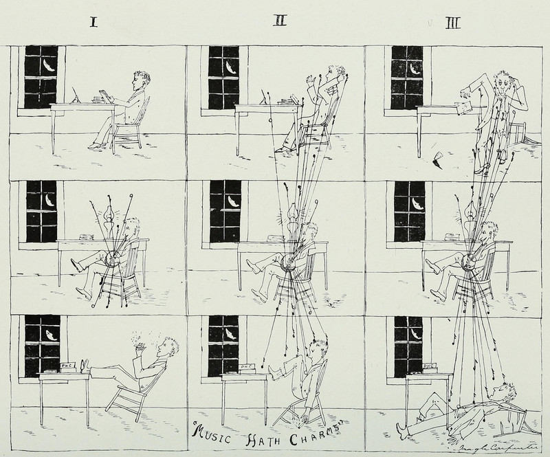 #vintage illustration #demon #imp #anthropomorphism #vintage yearbook #yearbook #faces in things #banjo #1890s #illustration