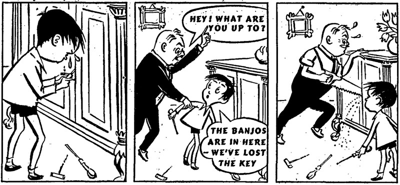 "The banjos are in here — we've lost the key."  From The Children's Newspaper1951.