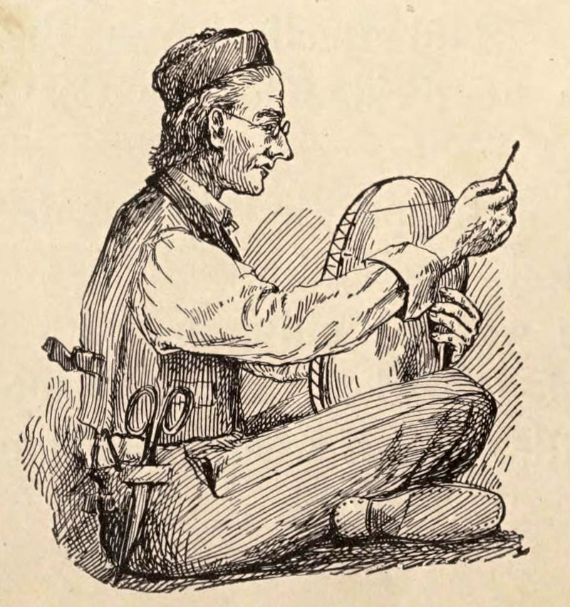 Tailoring a bean.  From Grimm's Fairy Stories, Supplementary to First Reader by M. Winifred Haliburton, 1900.