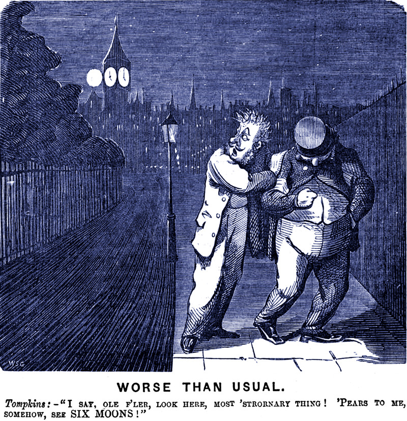 The appearance of six moons, two within the clock tower and the rest courtesy of double-vision, from an 1863 issue of Fun magazine.