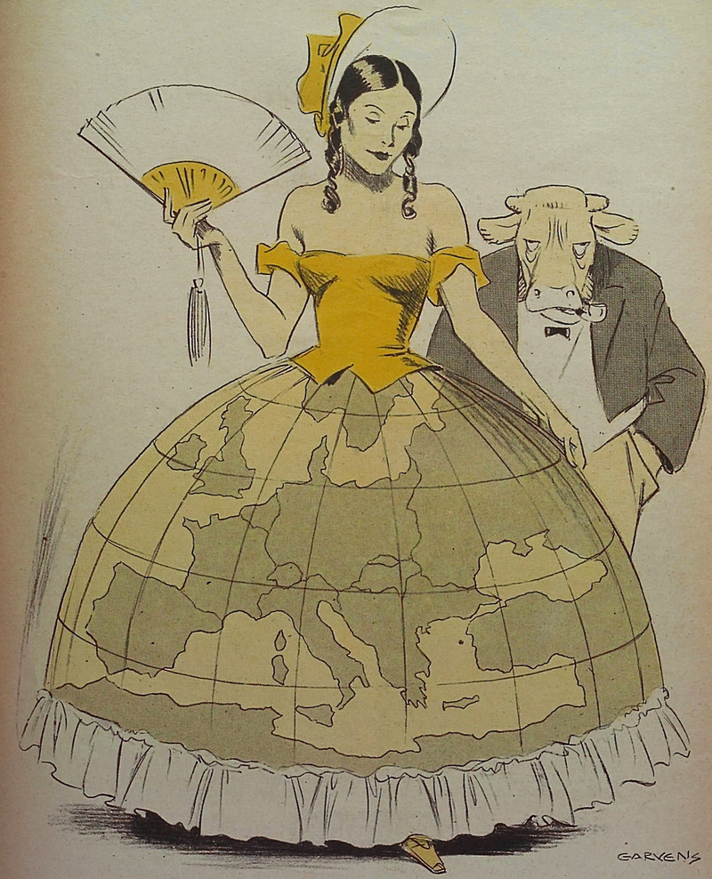 #vintage illustration #political cartoon #earth #fashion #vintage fashion #costume #1940s #illustration #hoop skirt #earth dress #world costume #big hips #earth costume